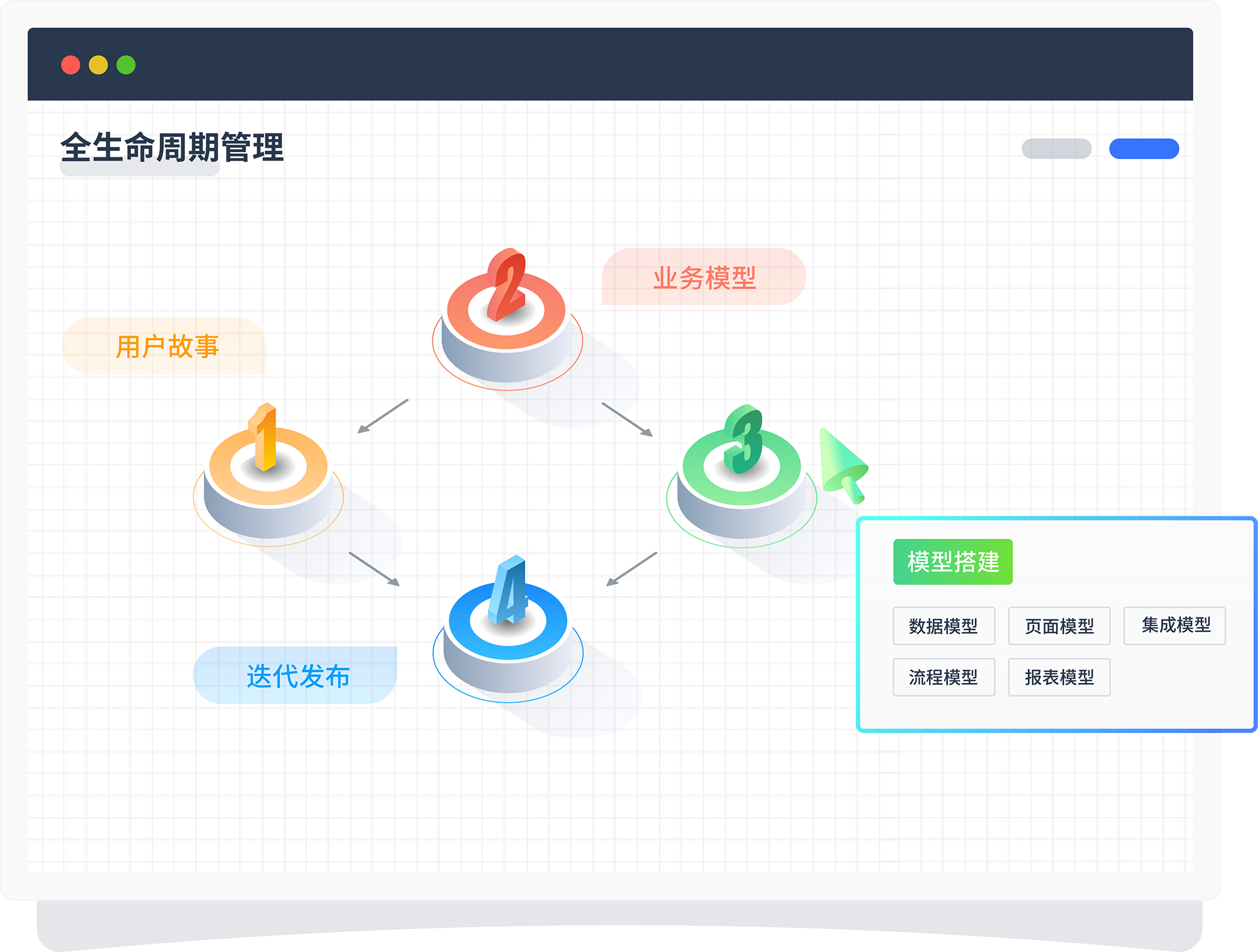 围绕产品的用户故事——模型设计/迭代——模型搭建——模型发布,进行系统的全生命周期闭环管理。